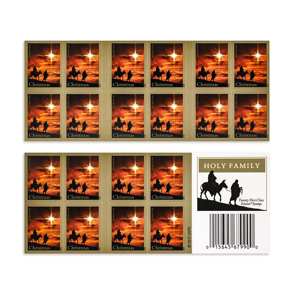 Art director William Gicker, designer Greg Breeding, and artist Nancy Stahl created the stamp’s artwork. It features Joseph leading a donkey carrying Mary and baby Jesus under a shining star.
