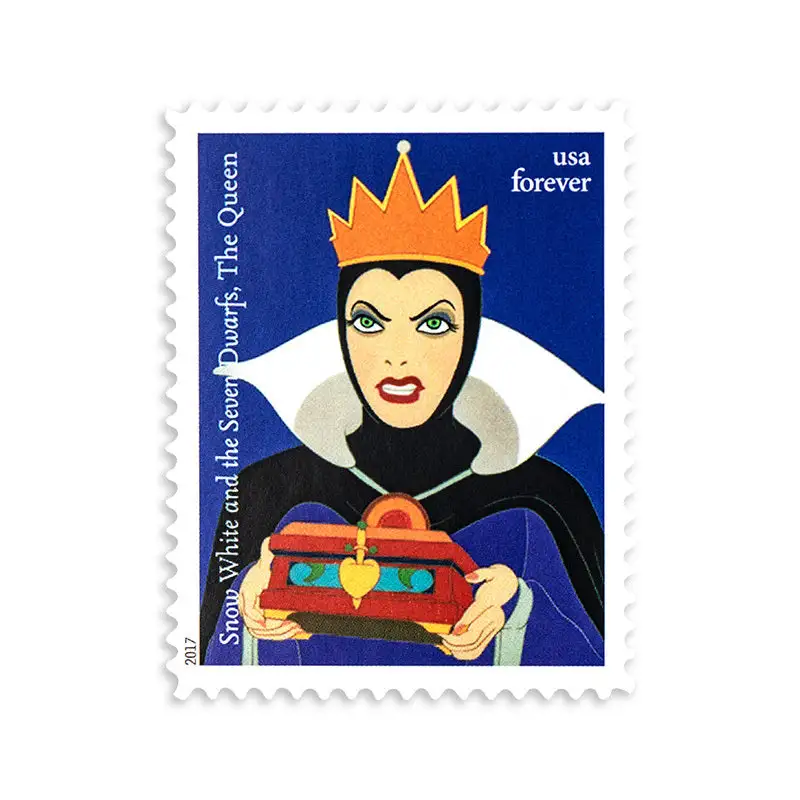 About the stamp design: Features the evil Queen from Snow White. Disney Creative Director David Pacheco and the Walt Disney Studios Ink & Paint Department created new art for the stamp.