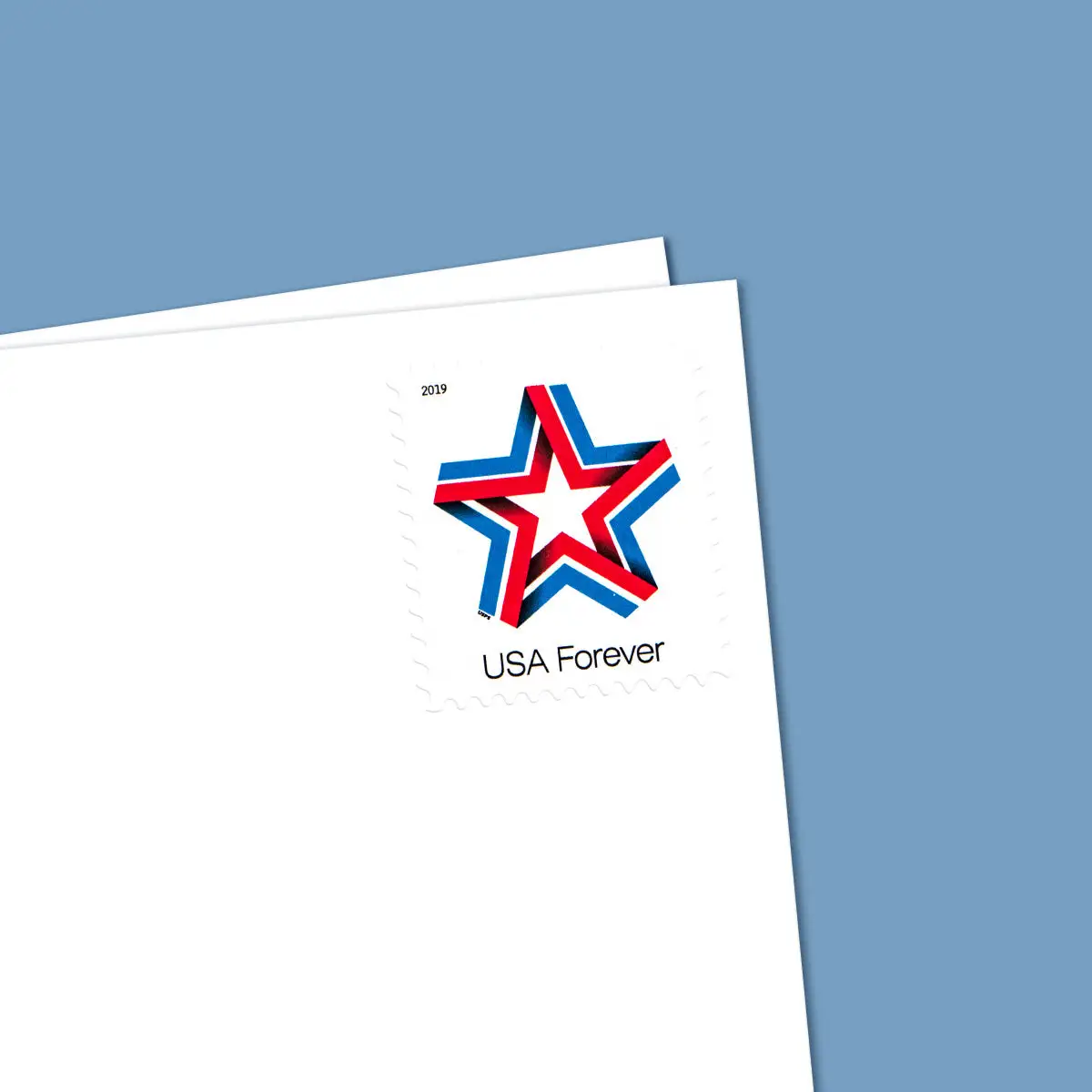 Presented as “a stamp designed to meet the needs of business mailers,” the artwork is described as featuring a digital star of red, white and blue ribbon, with the white space in the middle of the ribbon creating a second smaller star. “The tricolored ribbon, folded into a patriotic symbol,” said a USPS press release, “is intended to evoke the connectedness of the American people.”