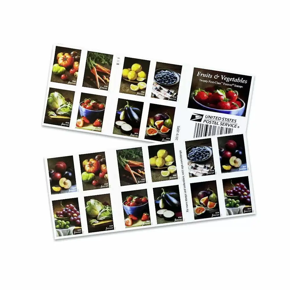 Each stamp features a collection of one kind of fruit or vegetable: red and black plums, heirloom and cherry tomatoes, carrots, lemons, blueberries, red and green grapes, lettuces, strawberries, eggplants and figs.?