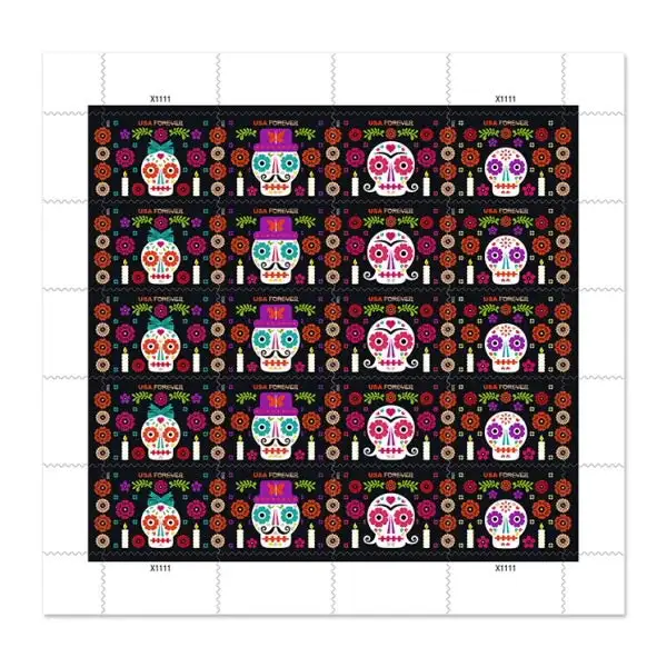 This pane of 20 Forever stamps contains five identical rows of four colorful stamps featuring several iconic elements of a traditional Day of the Dead offering. Stylized, decorated ?¡ãsugar skulls?¡À are personalized as family members ?a a child with a hair bow, a father sporting a hat and mustache, a mother with curled hair, and another child. The vibrant colors of marigold flowers and other embellishments, along with the white of the sugar skulls, stand out brightly from the stamps?¡¥ black background.