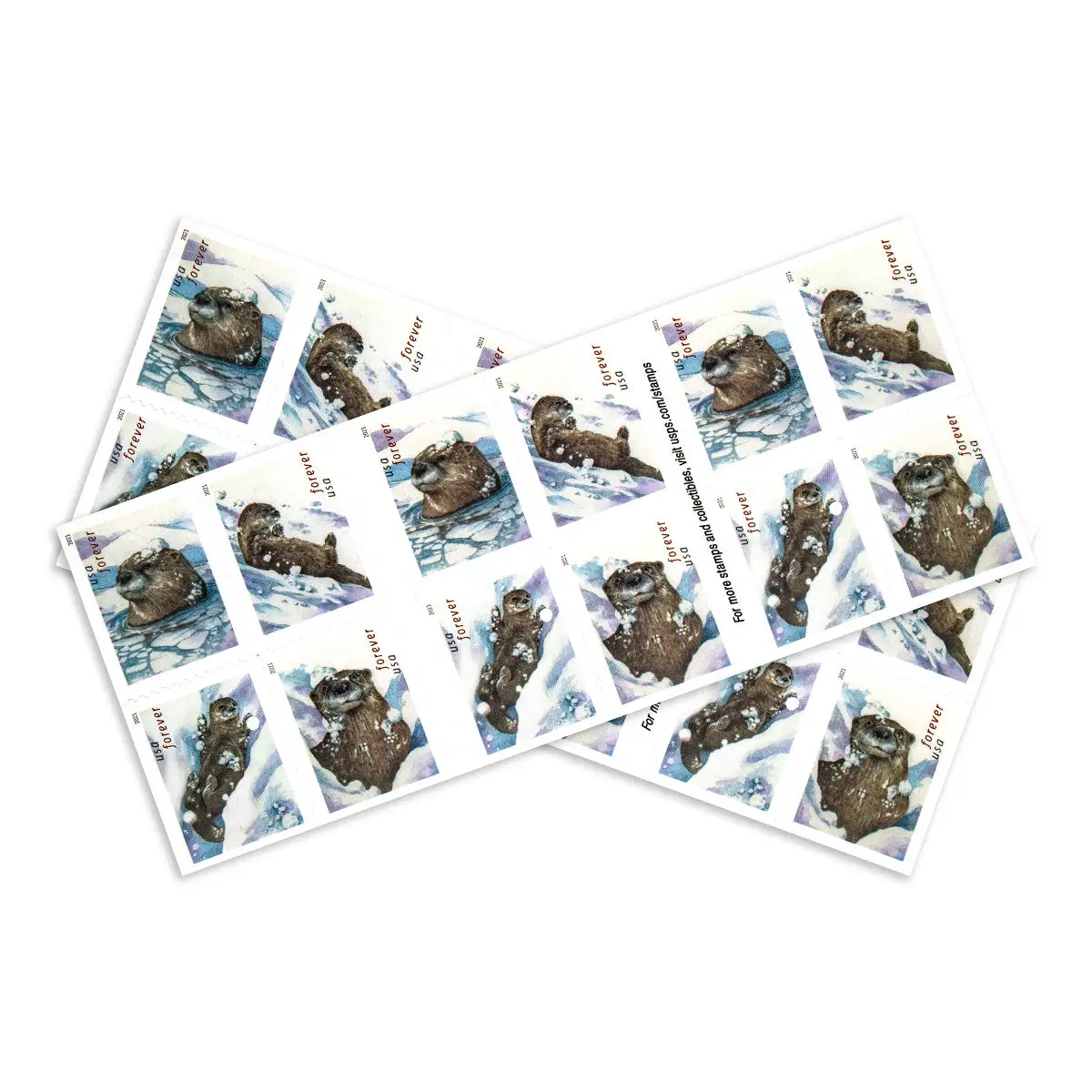 Otters in Snow, a booklet of 20 stamps featuring four scenes of the alert and playful North American river otter reveling in a winter landscape.