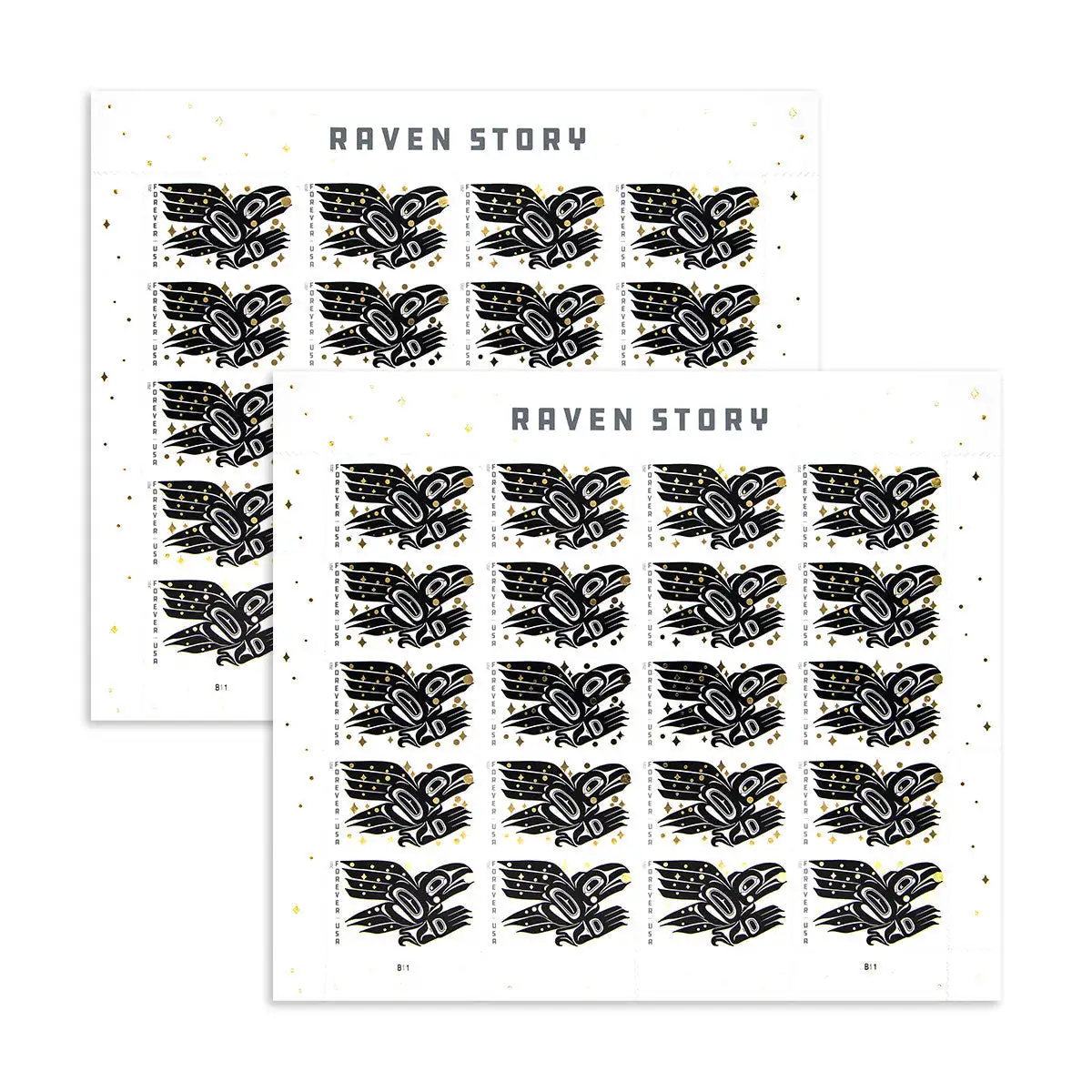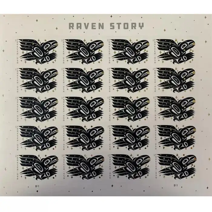 The stamp is inspired by the traditional story of the raven setting the sun, moon and stars free. It depicts one of many stories about the raven, a figure of great significance to the Indigenous people of the northern Northwest Coast, part of the area that ranges from Southeast Alaska through coastal British Columbia and south into Washington state.