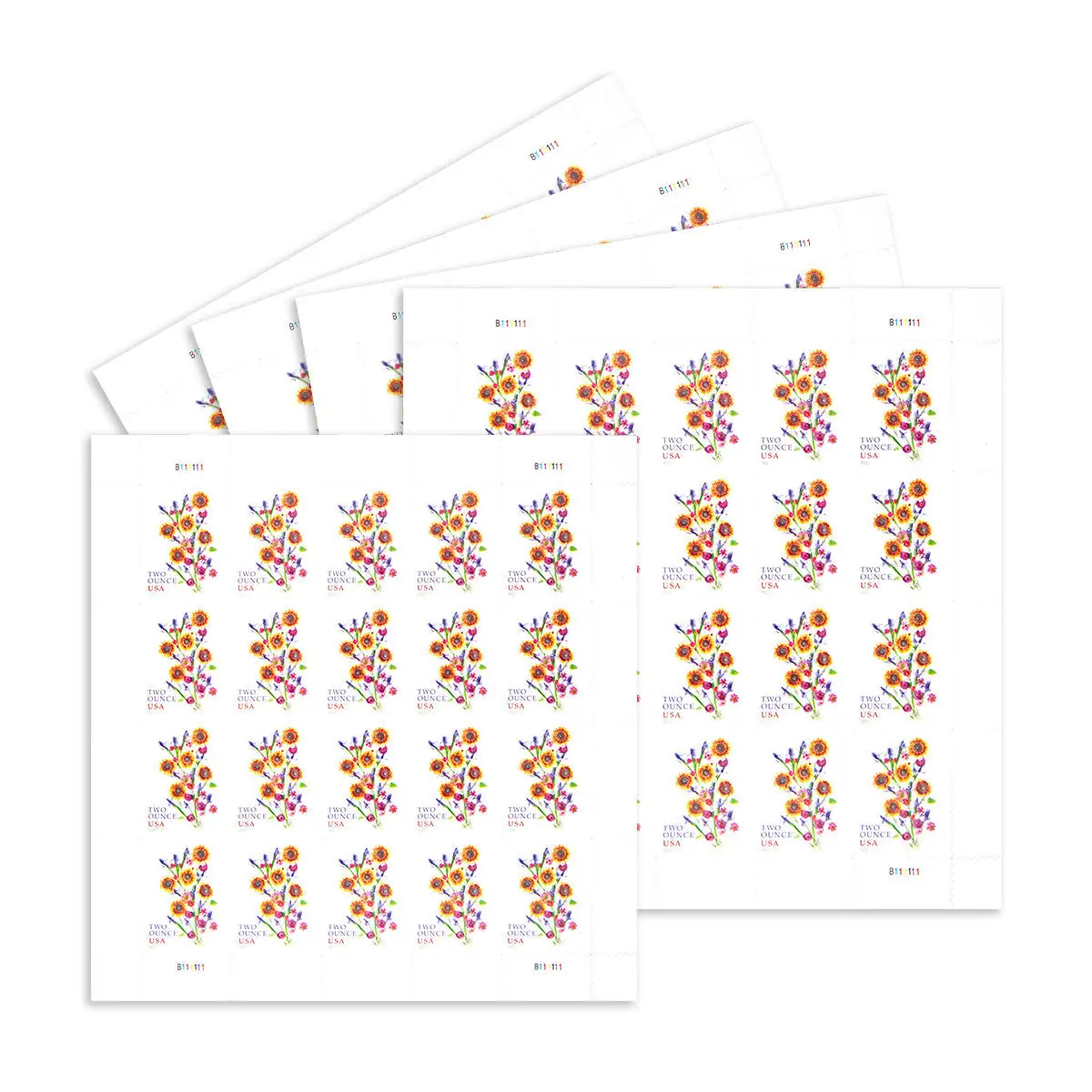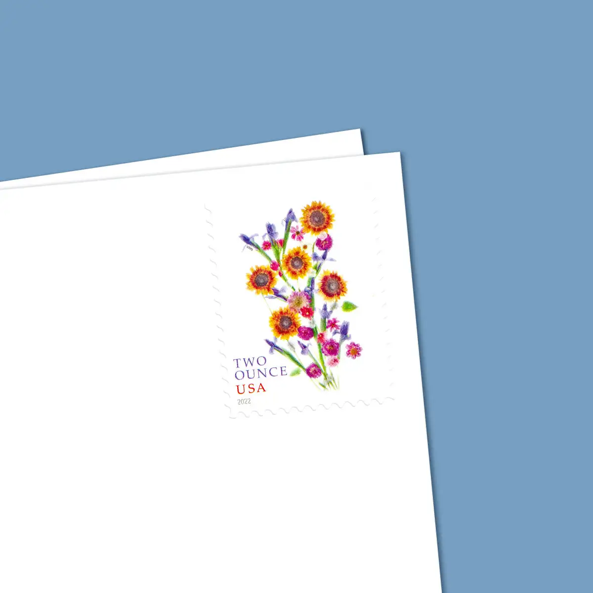 This new stamp features five sunflowers as part of a bright and beautiful bouquet. As a two-ounce stamp, Sunflower Bouquet can accommodate the weight of heavy invitations for birthdays, weddings, anniversaries, and other celebrations; oversized greeting cards; and mailings such as small gifts that require extra postage