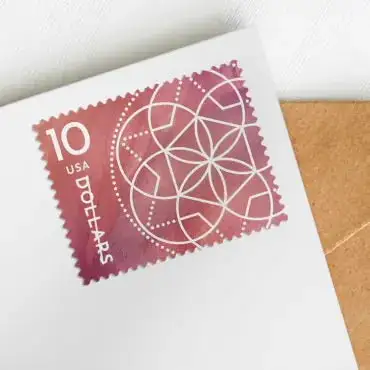 The new $10 Floral Geometry stamp complements similar $2 and $5 stamps issued in 2022. These stamps lend a contemporary appearance to packages, large envelopes and other mailings.