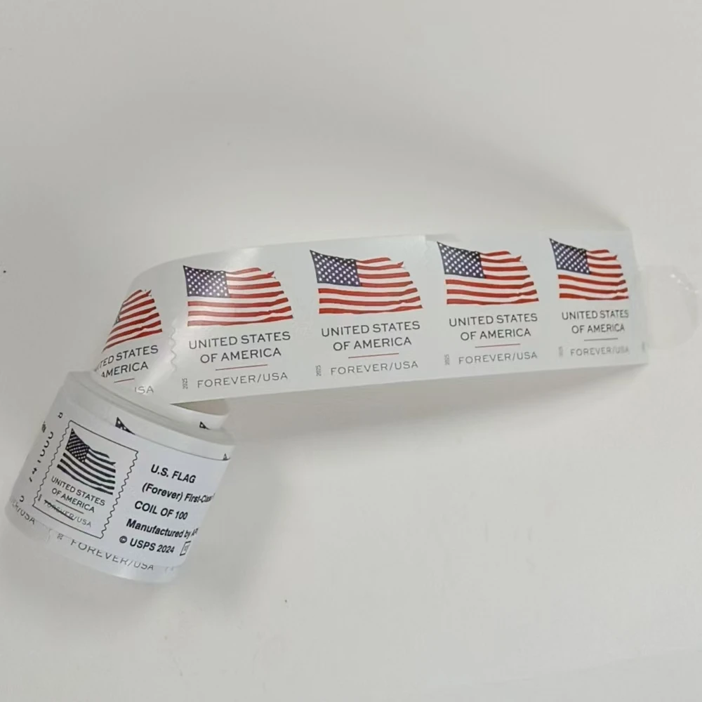 The stamp features an image of the Stars and Stripes, fluttered by a breeze, against a bright white background. Beneath the flag, “UNITED STATES OF AMERICA” has been rendered in blue type above a horizontal red line. “FOREVER / USA” appears along the bottom of the stamp in gray lettering.